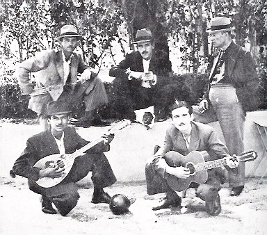 Michalis Genitsaris(bouzouki) and band in 1941. Genitsaris wrote some of the best songs of this period. Some give a lyrical snapshot of the occupation including Saltadoros (about stealing gas cans from German trucks), Epidromi Sto Peiraia (the bombing and destruction of the port of Pireaus), Mavragorites (the blackmarketeers), Enas Leventis Esvise (the death of a resistance fighter), and Stelios Kardaras (the execution by the Germans of an 18 year old resistance fighter). Other musicians from the period included Vassilis Tsitsanis, Manolis Hiotis, Nikos Mathesis, Markos Bambakaris, Marika Ninou, Sotira Bellou, and Ioannis Papaioannou.
